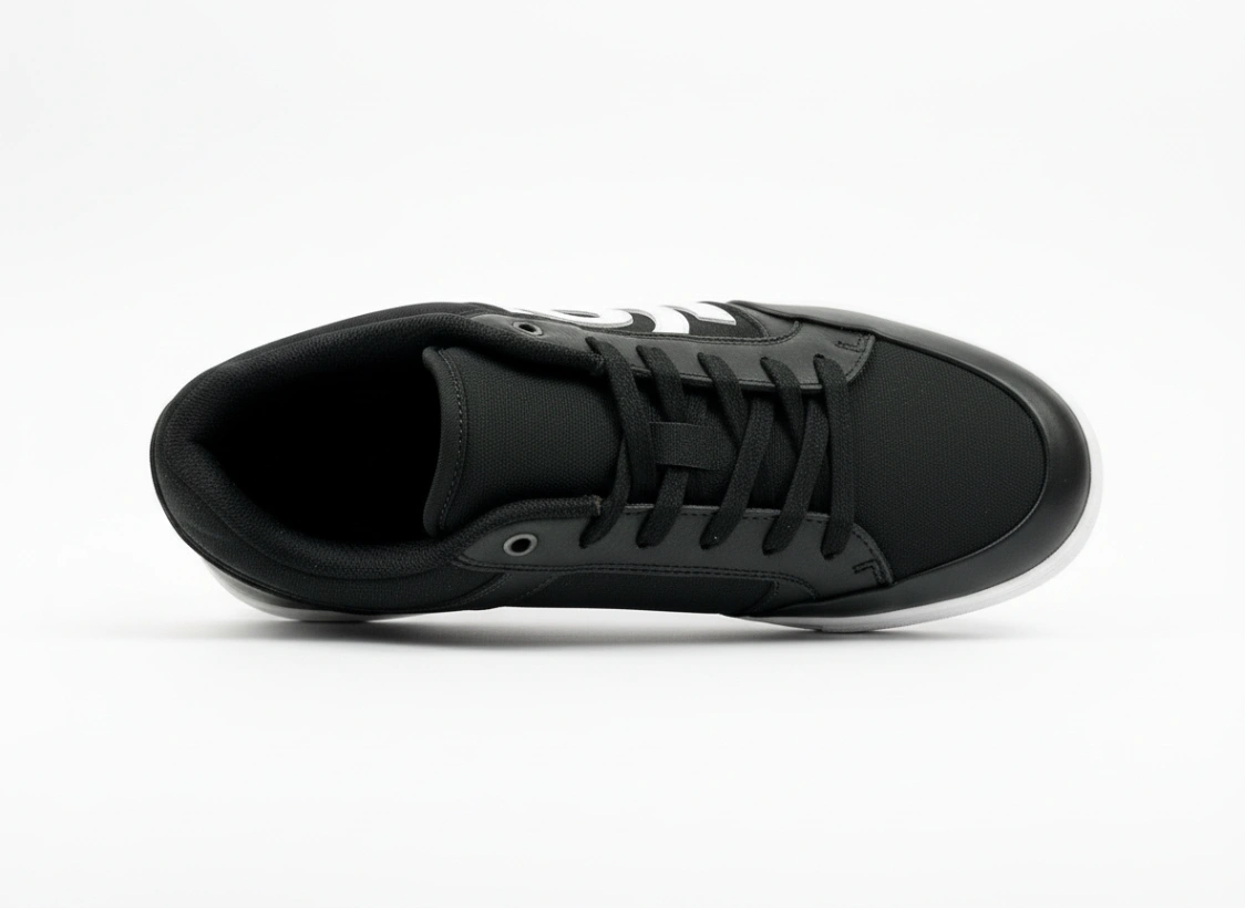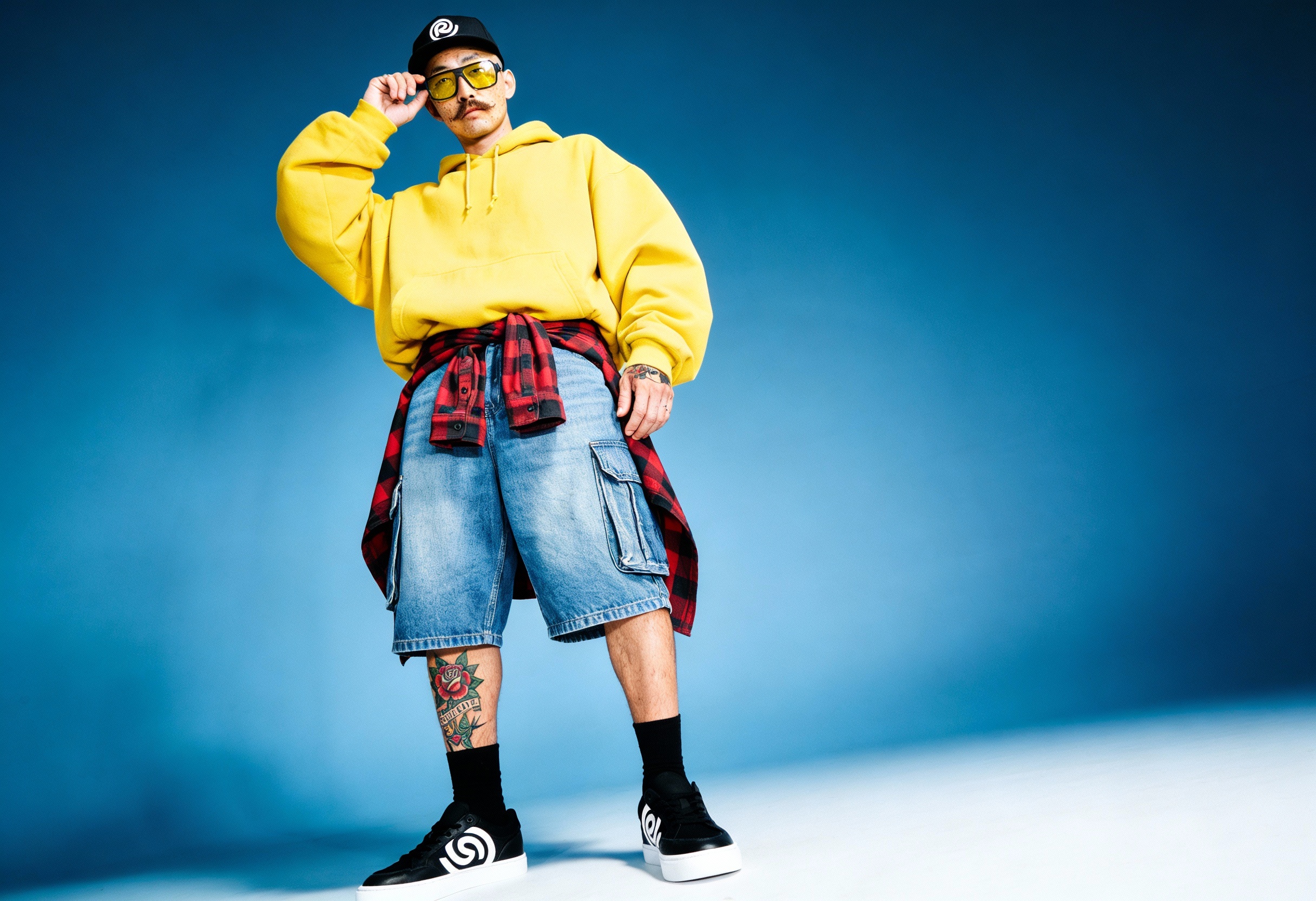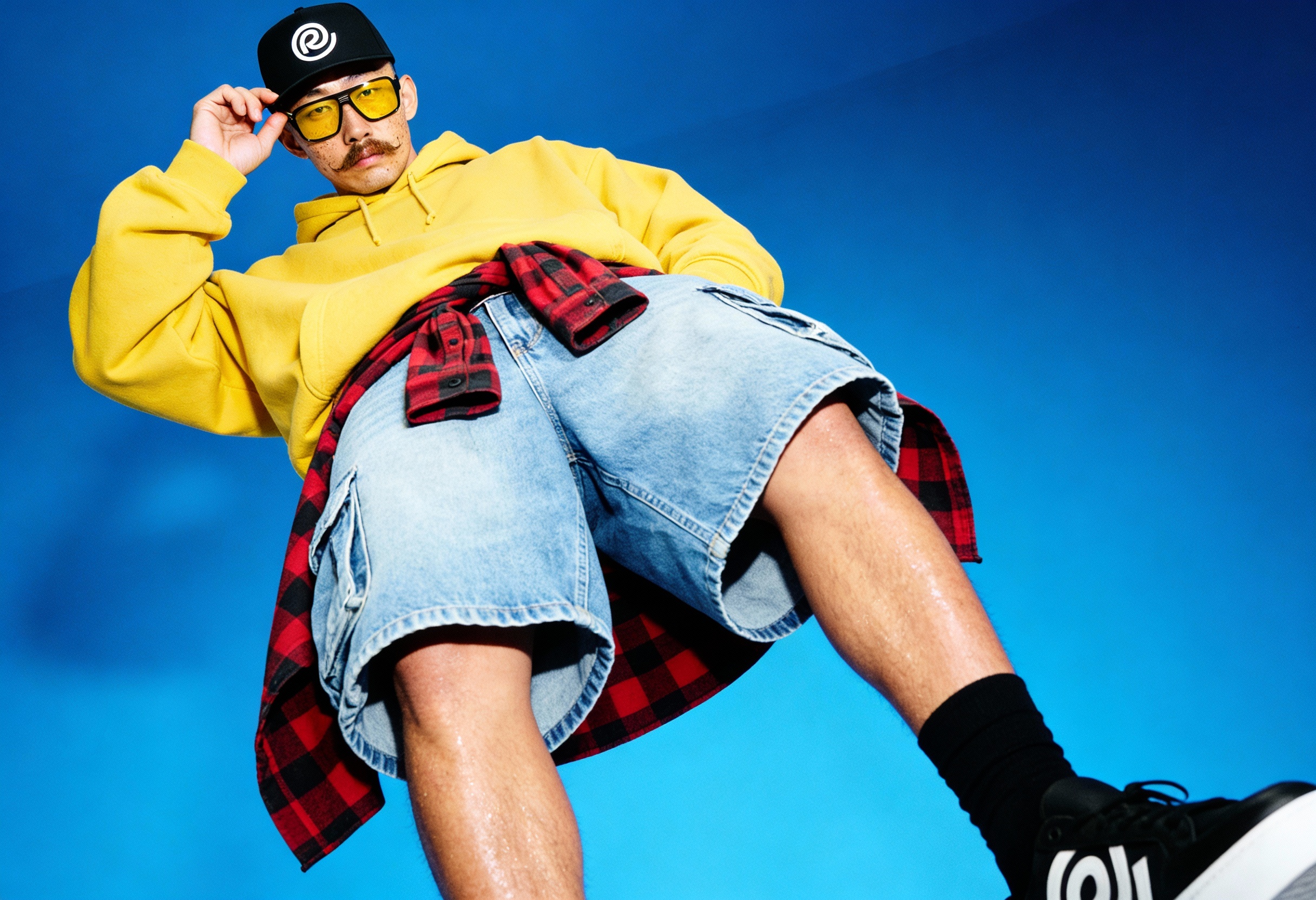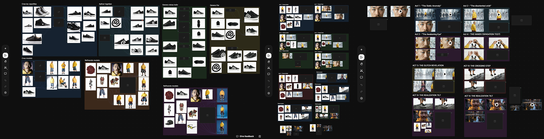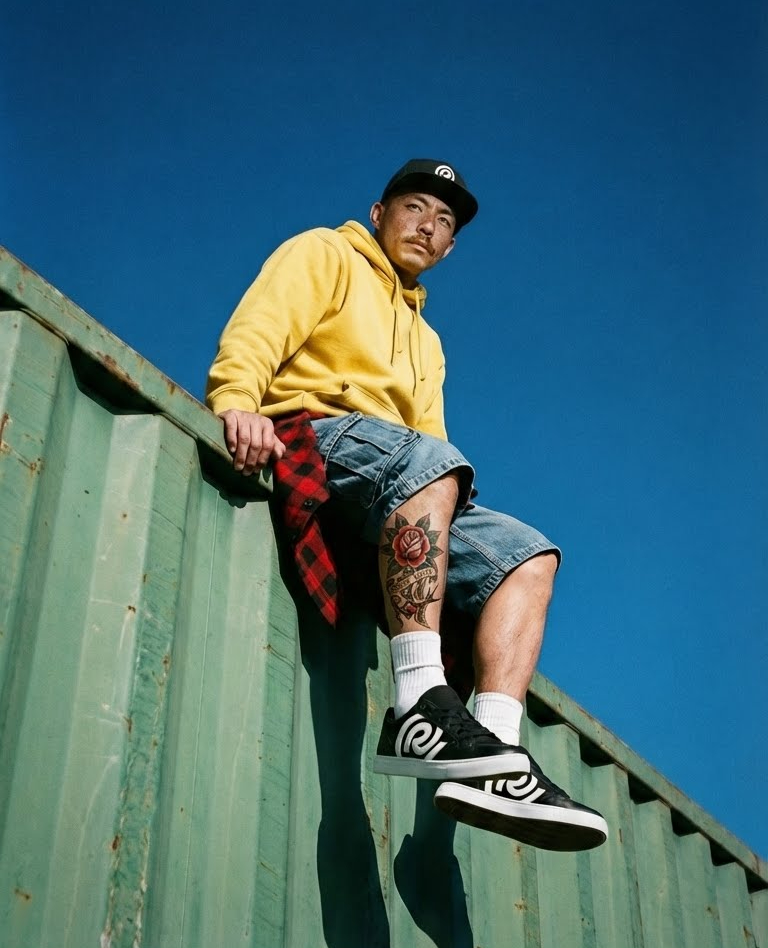 El verdadero reto técnico fue mantener la integridad de estos rasgos específicos a través de múltiples generaciones y escenarios. Para su campaña de debut, el entorno se completó con el diseño de producto: unas zapatillas personalizadas que rinden homenaje a las marcas más icónicas del movimiento skater.