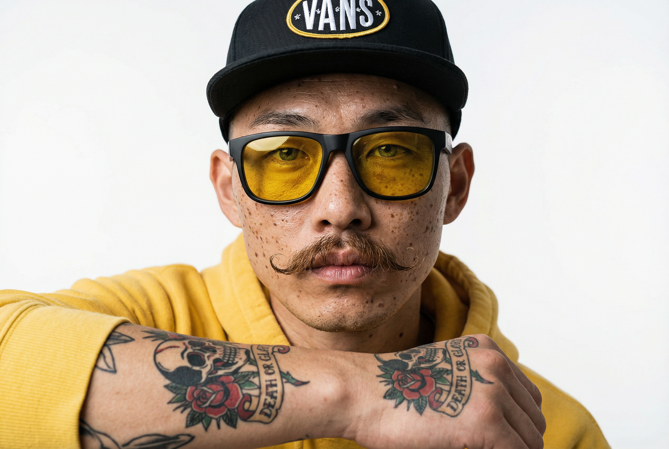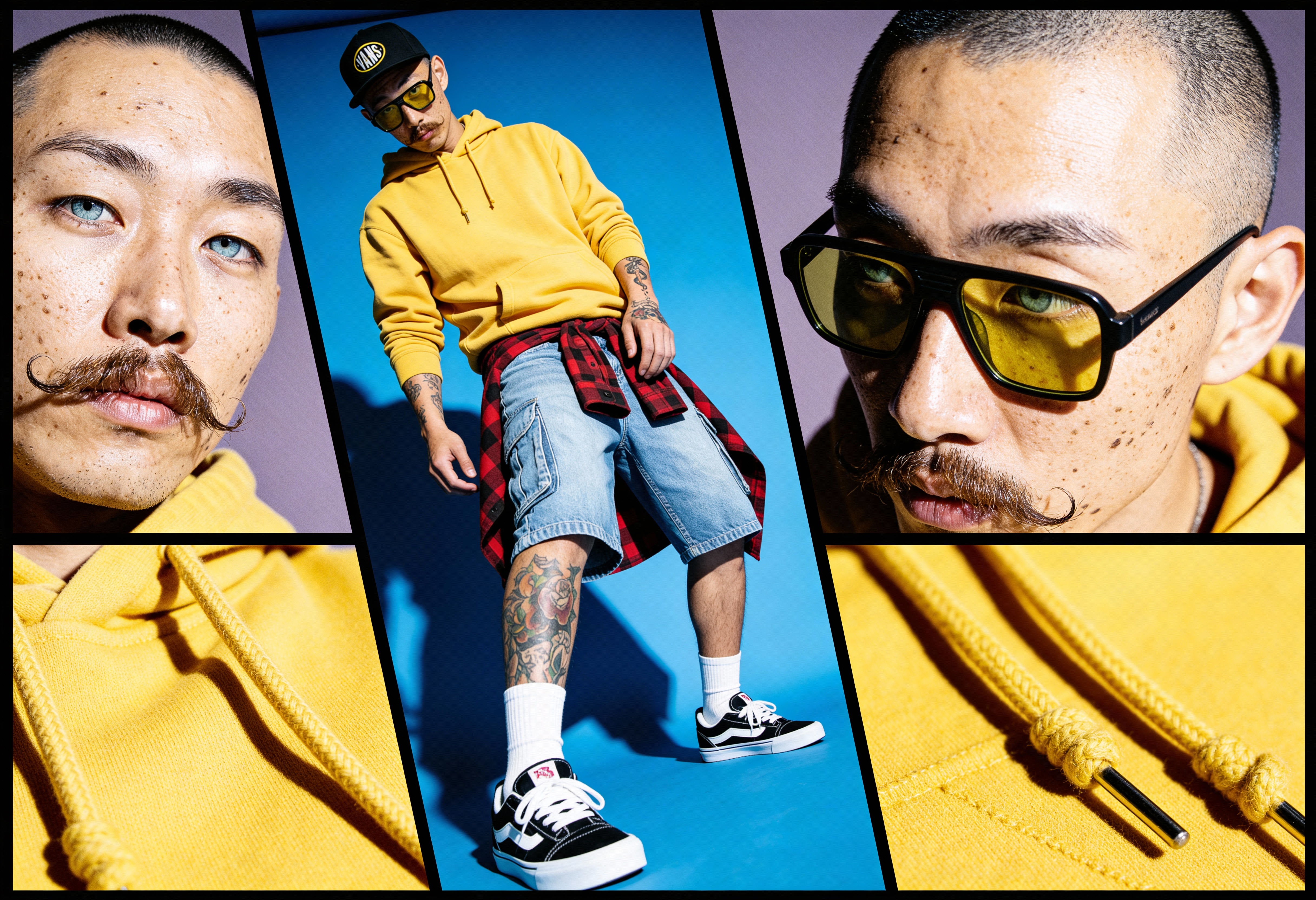 Así nació Ren (del japonés "pureza"). Diseñado desde cero, Ren es un joven asiático en sus 20s definido por una estética muy particular: cabeza rapada, ojos azul pálido, pecas marcadas, un bigote estilo vintage y tatuajes diseñados minuciosamente para él.