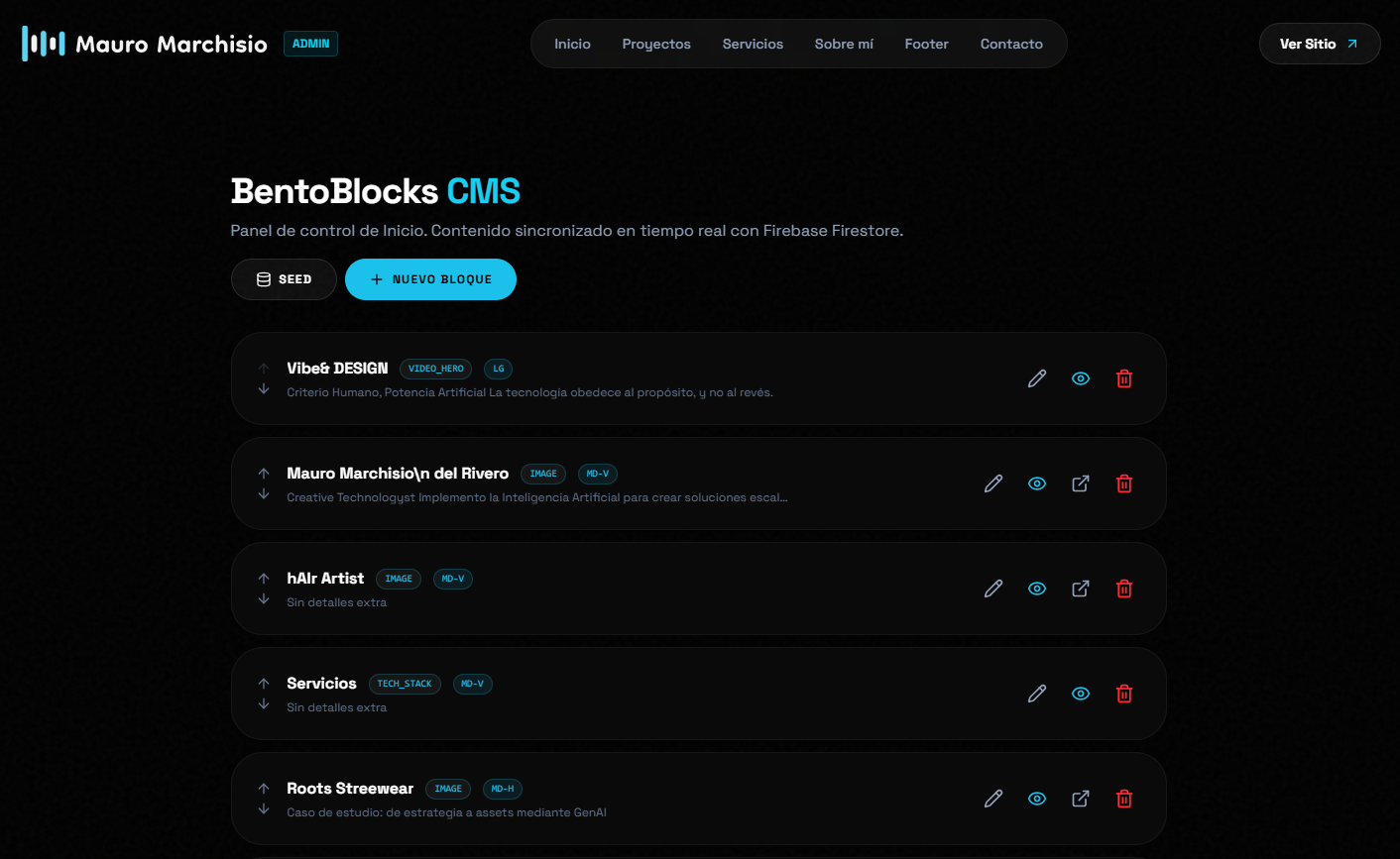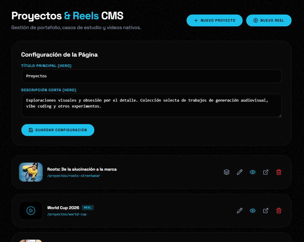 1. Panel de Administración a Medida (Custom CMS) Se descartó el uso de sistemas heredados como WordPress. En su lugar, se desarrolló un panel administrativo privado (/admin) moderno, seguro y totalmente a medida, integrado en el mismo repositorio. Gestión Intuitiva de Bento Grids: Interfaz modular para editar, agregar, reordenar (Drag & Drop lógico) y eliminar servicios y herramientas del layout principal sin tocar una sola línea de código. Portafolio Multimodal Dinámico: Un CRUD avanzado de proyectos y Reels. Permite la subida asíncrona de videos nativos (.mp4/.webm) e imágenes directamente al Storage, ajustar "Content Blocks" (bloques narrativos para cada caso de estudio) y determinar milimétricamente el espacio que ocupan en el grid (Span). Edición en Vivo y Configuraciones Globales: Control total sobre copys estratégicos como el "Hero Text" de inicio, configuraciones SEO meta, y elementos dinámicos como enlaces de redes sociales.